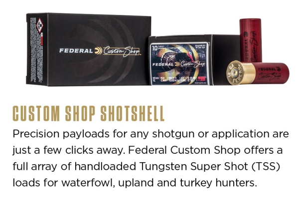 “Launched in the fall of 2019, the product line in our Federal Custom Shop continues to grow,” said Federal Shotshell Product Manager Josh Vickers. “This year, we have added several options of Tungsten Super Shot (TSS) with hefty payloads to deliver maximum pellet counts. These are the types of ultra-heavy payload shotshells that we can’t load on our factory machines effectively and efficiently. They really can only be built as handloads, so we are happy to offer them as Custom Shop offering.”