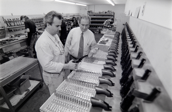 Anthony Imperato (left) and his father Louis Imperato (right) inspecting trigger guards at their Colt Black Powder Arms Co. factory in Brooklyn, NY in May 1995, a year prior to them starting Henry Repeating Arms.
