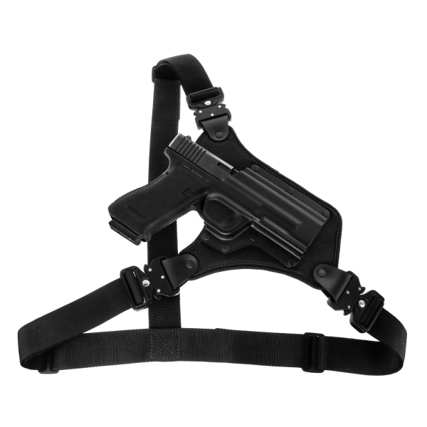 Lastly, 2” wide tubular webbing harness straps distribute the weight of a heavy handgun for maximum comfort. One strap goes over either shoulder, while the second wraps around the torso for highly effective weight distribution.