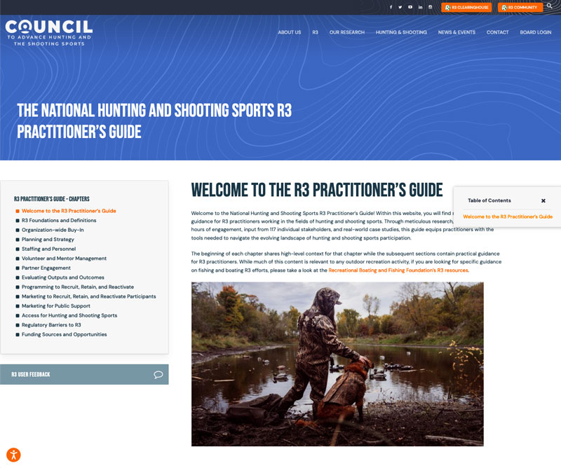 Culminating from a two-year deep dive by the Council, The Assessment Group (TAG), TAG Review Panel and DJ Case and Associates, the R3 Practitioner’s Guide encompasses a wealth of knowledge curated by conservation agency, non-profit organization, industry experts and thought leaders. Through meticulous research and real-world case studies, this guide equips practitioners with the tools needed to navigate the evolving landscape of hunting and shooting sports participation.