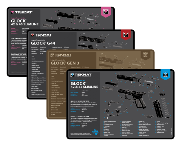 Irving, TX – TekMat, an industry leader for gun cleaning and gunsmithing mats, is proud to announce their new line of GLOCK® gunsmithing mats for GLOCK® 42/43, GEN 3, and G44 models.