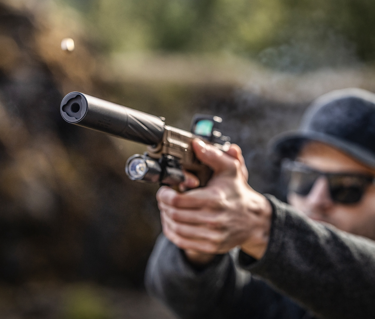 The BANISH 9 reduces sound output from 9mm rounds by up to 34 decibels. It is made from titanium and aircraft-grade 7075 aluminum and boasts 14 baffles. The BANISH 9 is 7.16 inches long and weighs 8.57 ounces when configured with the Micro Booster installed. The BANISH 9 is also compatible with optionally available direct-thread mounts for popular PCC and rifle barrel thread pitches. Rated for popular cartridges like .380 ACP, 9mm, .300 BLK, and 350 Legend, the BANISH 9 is full auto rated for 9mm super- and subsonic loads, as well as .300 BLK subsonic ammo.