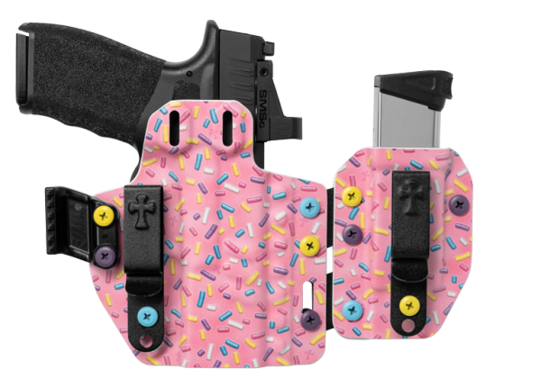 The “birthday cupcake” theme puts a creative spin on the serious business of personal defense. Consumers can choose the Sprinkles custom print for the Custom Accomplice Mag Carrier and the following Crossbreed holster patterns: