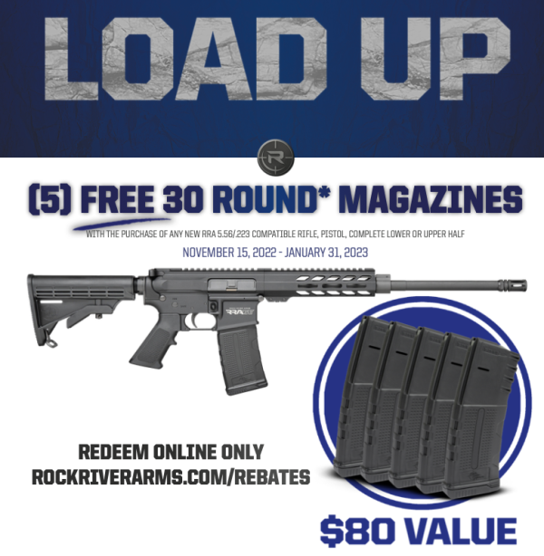 From November 15, 2022 through January 31, 2023, Rock River Arms will provide retail consumers with five free 30-round magazines with the purchase of any new RRA 5.56/.223-compatible rifle, pistol, complete lower receiver assembly, or complete upper receiver assembly. That is an $80 value added to a new firearm or qualifying sub-assembly!
