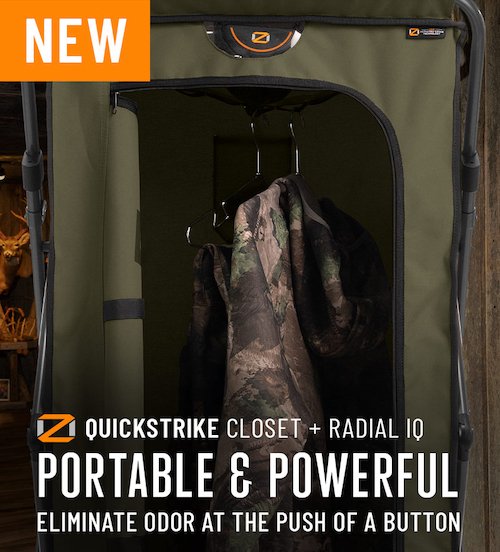We asked ScentLok Marketing Director, Steve Allie, what makes the new Quickstrike Closet Combo Kit so special. “It’s packable,” said Allie. “You can throw it in the truck and take it to deer camp. It breaks down and sets in seconds and slips right in the included travel bag.”