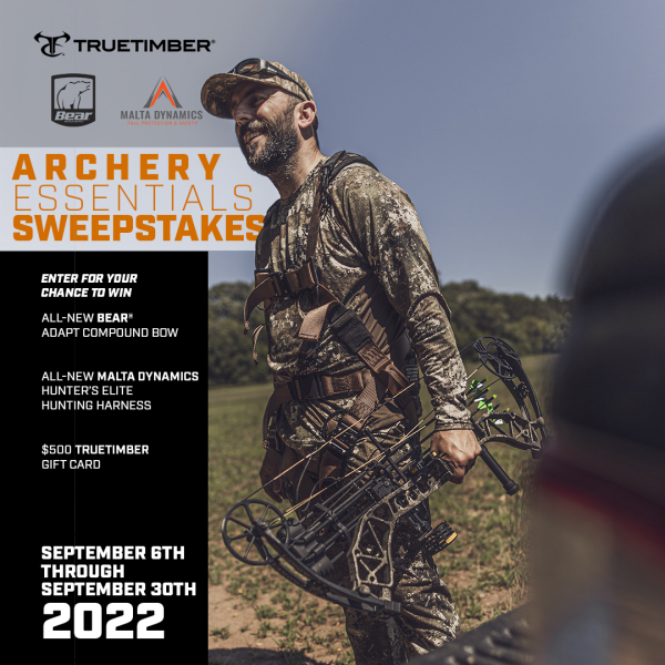 INMAN, S.C. – September 6, 2022 – TrueTimber has partnered with Bear Archery and Malta Dynamics to announce the 2022 Archery Essentials Giveaway. One fan will be randomly selected to win the grand prize package designed around the bow hunting essentials. Fans have multiple opportunities to enter using the Archery Essentials giveaway landing page. The entry period begins today and ends September 30, 2022, at 11:59 p.m. EST.