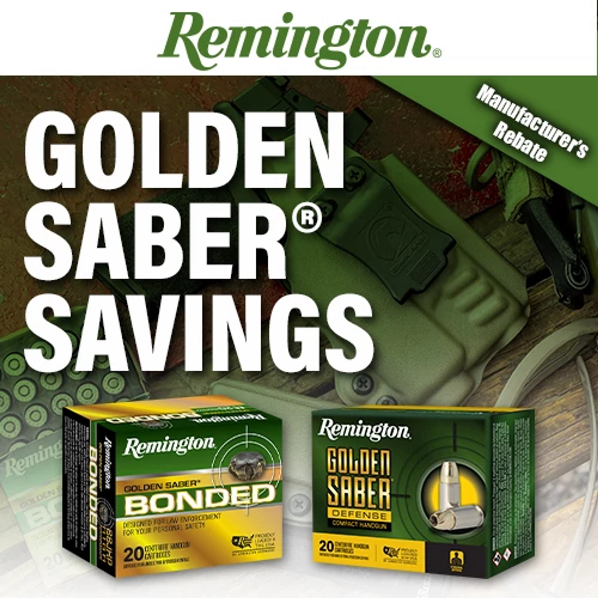 To qualify, customers must purchase at least two boxes of eligible Remington Golden Saber self-defense handgun ammunition. They will receive a 20 percent rebate of the purchase price, up to a maximum of $200 per person or household. Qualifying Golden Saber products include Golden Saber Defense, Golden Saber Bonded, and Golden Saber Defense Bonded. Each load is engineered for dependable performance in critical situations.