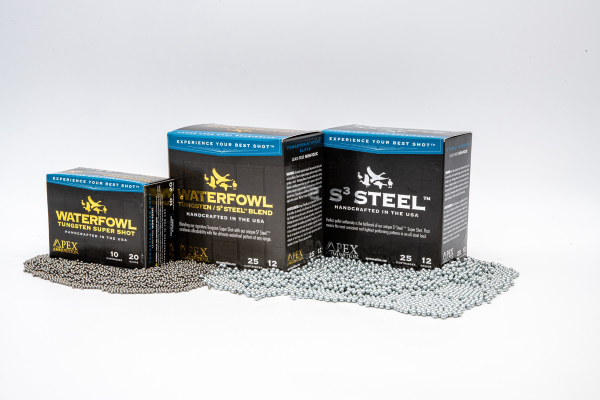 APEX Waterfowl TSS-S3 Steel Blend shotshells are handcrafted “duplex” loads that offer the best of both worlds, combining APEX’s premium, zinc-coated S3 Steel pellets with ultra-high density Tungsten Super Shot for a harder-hitting payload and improved terminal performance to reduce crippling.