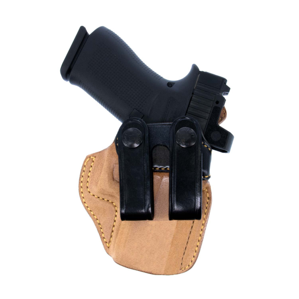 The Royal Guard 2.0 is supplied with removable black belt loops fitting belts up to 1 3/4”, with optional tan and black 1 1/4”, 1 1/2", and 1 3/4" belt loops available. It’s available for right hand draw, in two-tone color scheme using a natural holster body with a black collar and belt loops.