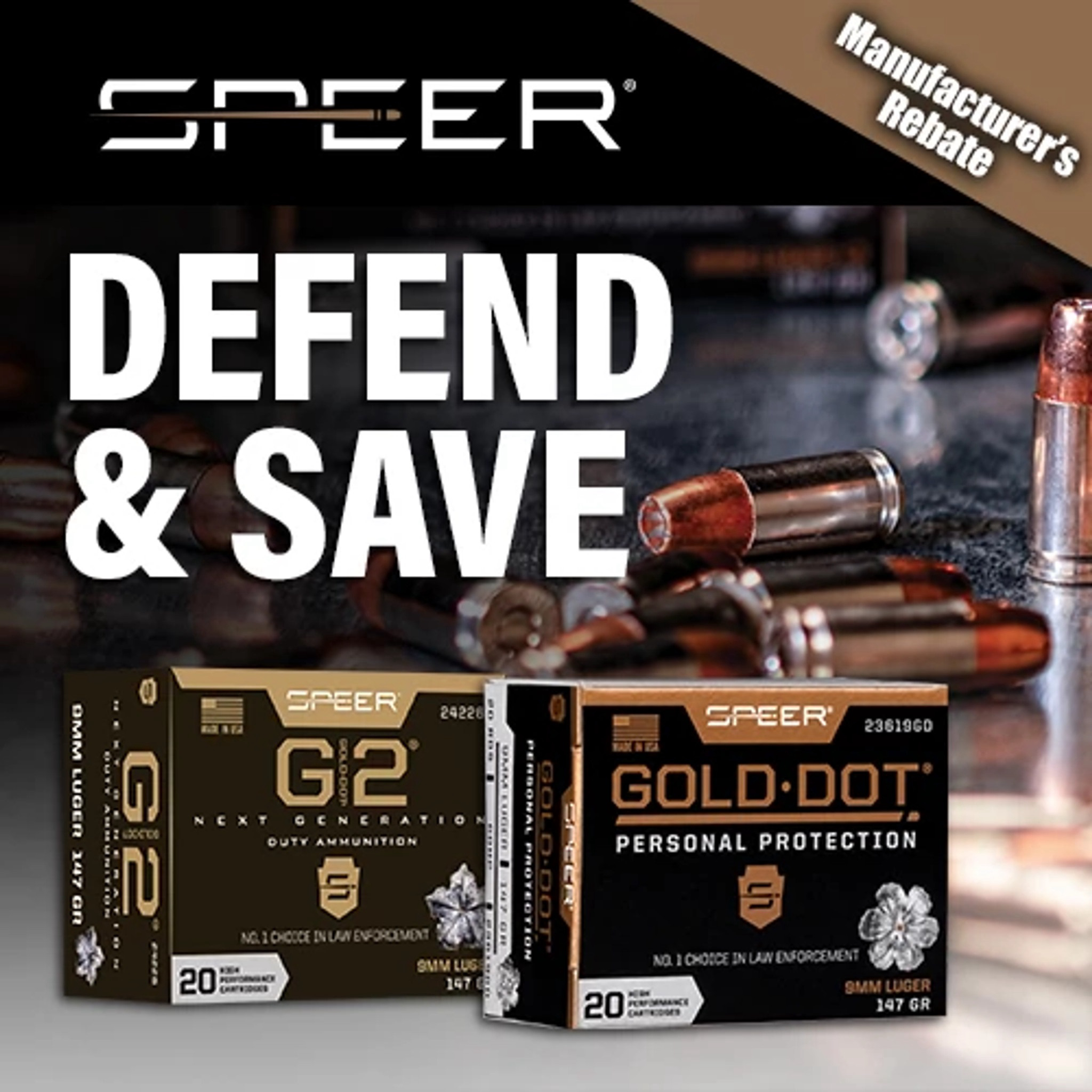 Qualifying products include trusted Speer loads, such as Gold Dot Personal Protection, which features bonded-core bullets for uniform expansion and optimal weight retention. Gold Dot G2 Personal Protection builds on this legacy with an advanced elastomer-filled hollow-point for even more reliable expansion through barriers. Gold Dot G2 Carry Gun is designed specifically for compact pistols, offering optimal performance in shorter barrels. For those who prefer a defensive carbine, the Gold Dot Carbine offers a high-performing load specifically designed for 16-inch barrels and longer. And Gold Dot Personal Protection Short Barrel is engineered to deliver full-power performance in today’s popular sub-compact concealed carry pistols.