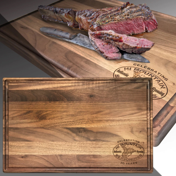 RIVERTON, Wyo. (May 25, 2021) — In honor of its 30th Anniversary, Hi Mountain Seasonings, is pleased to offer a Limited Edition solid wood cutting board. Measuring 11”x17”x1” thick, this 30th Anniversary cutting board is the ideal size for chopping vegetables and fruits, as well as carving meat and poultry. It has been carefully crafted with a grooved channel to catch juices when carving meat.